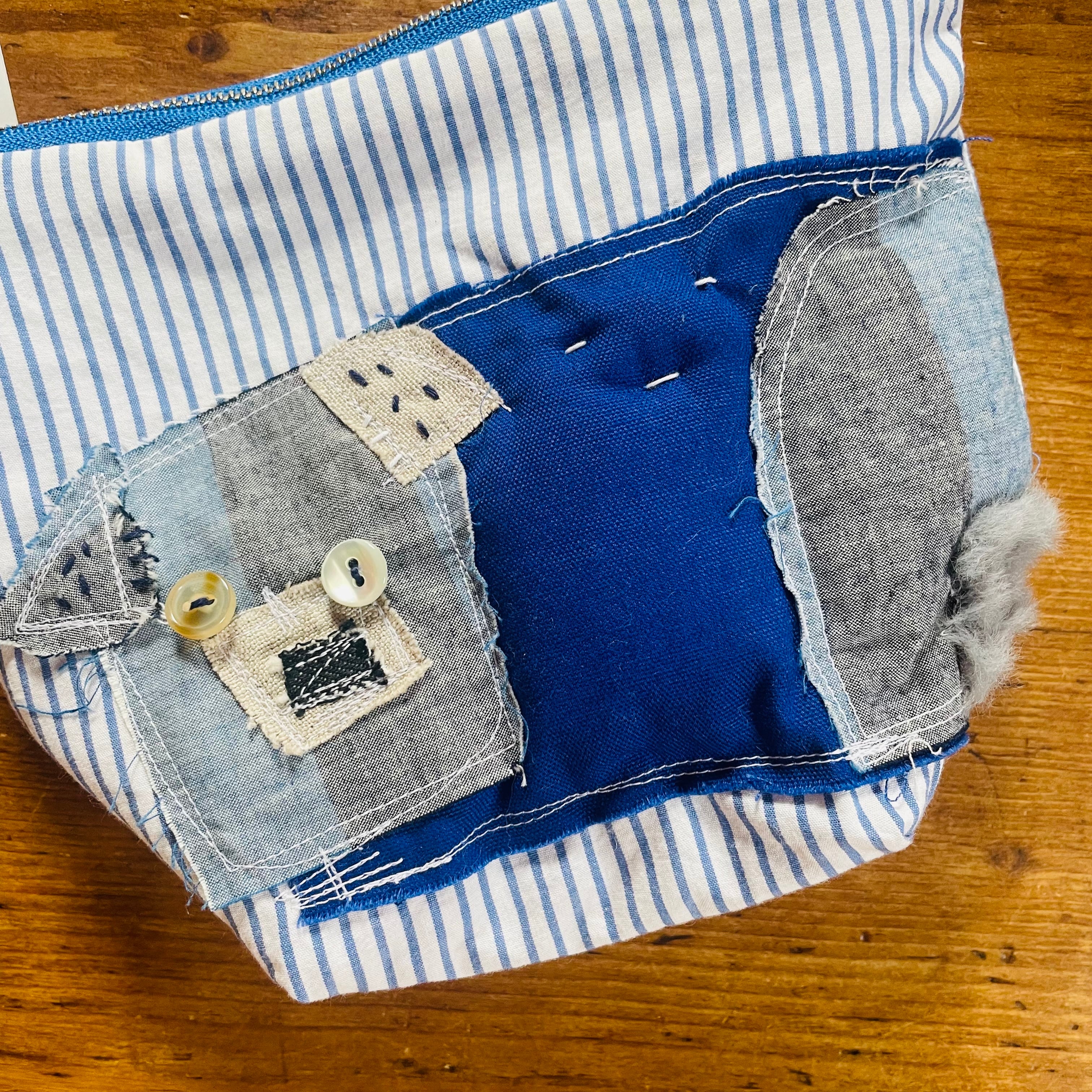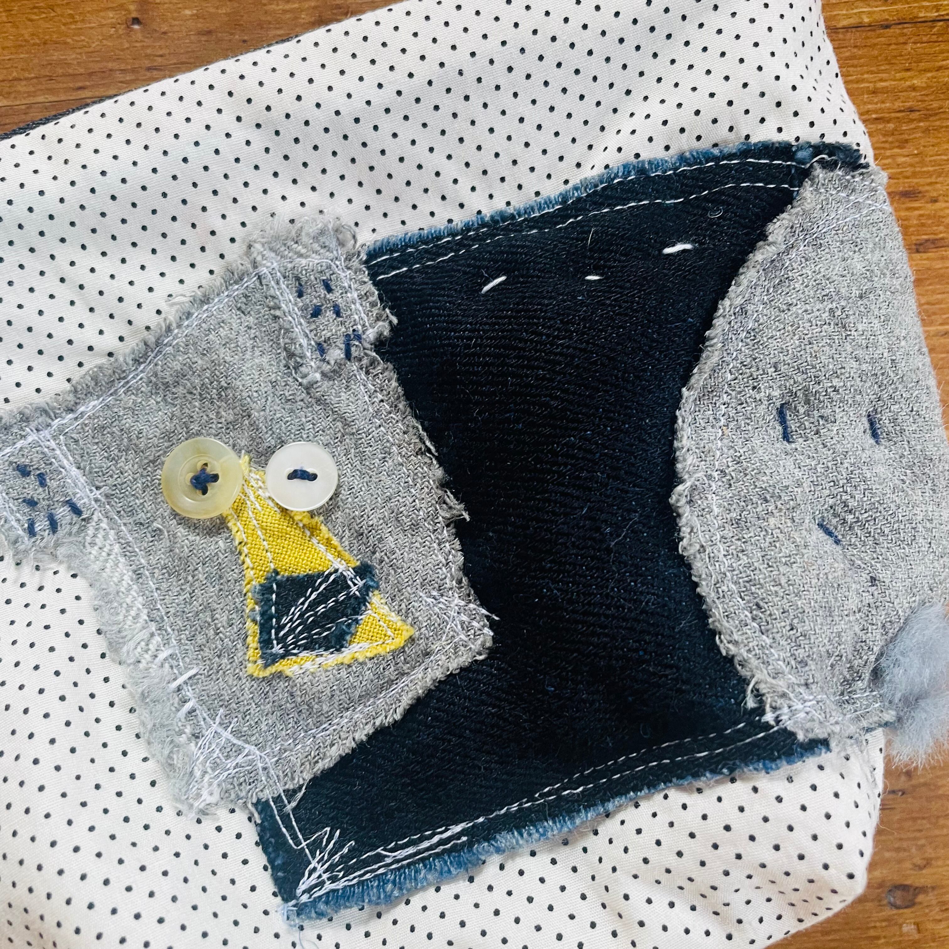 さまざまな布やボタンでコラージュした犬のふせ姿が楽しいポーチ♡