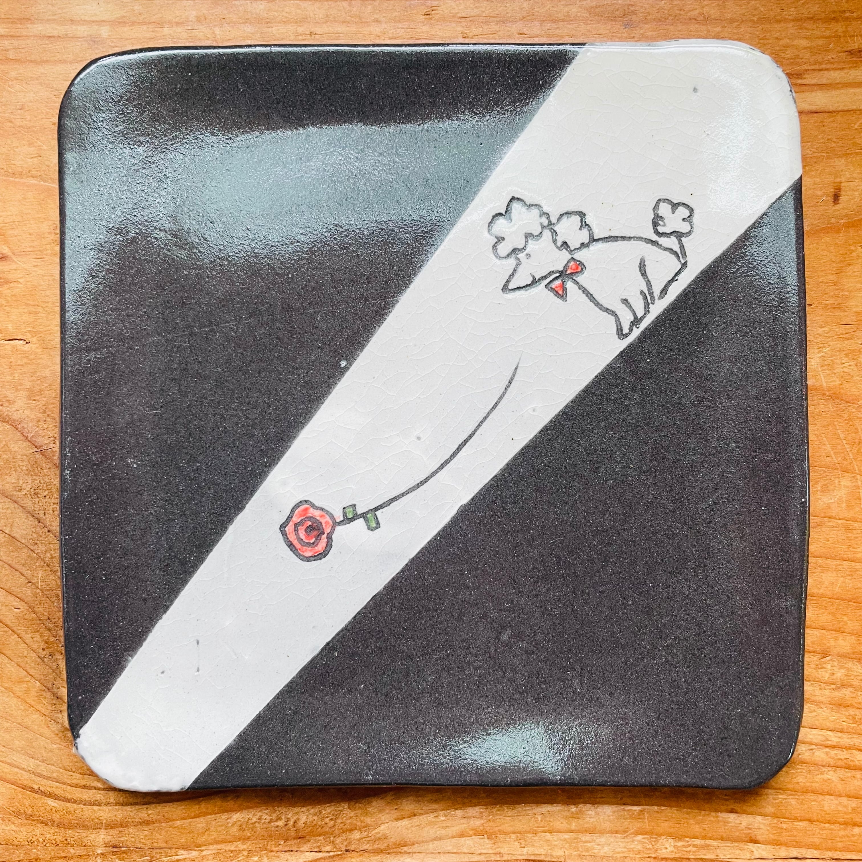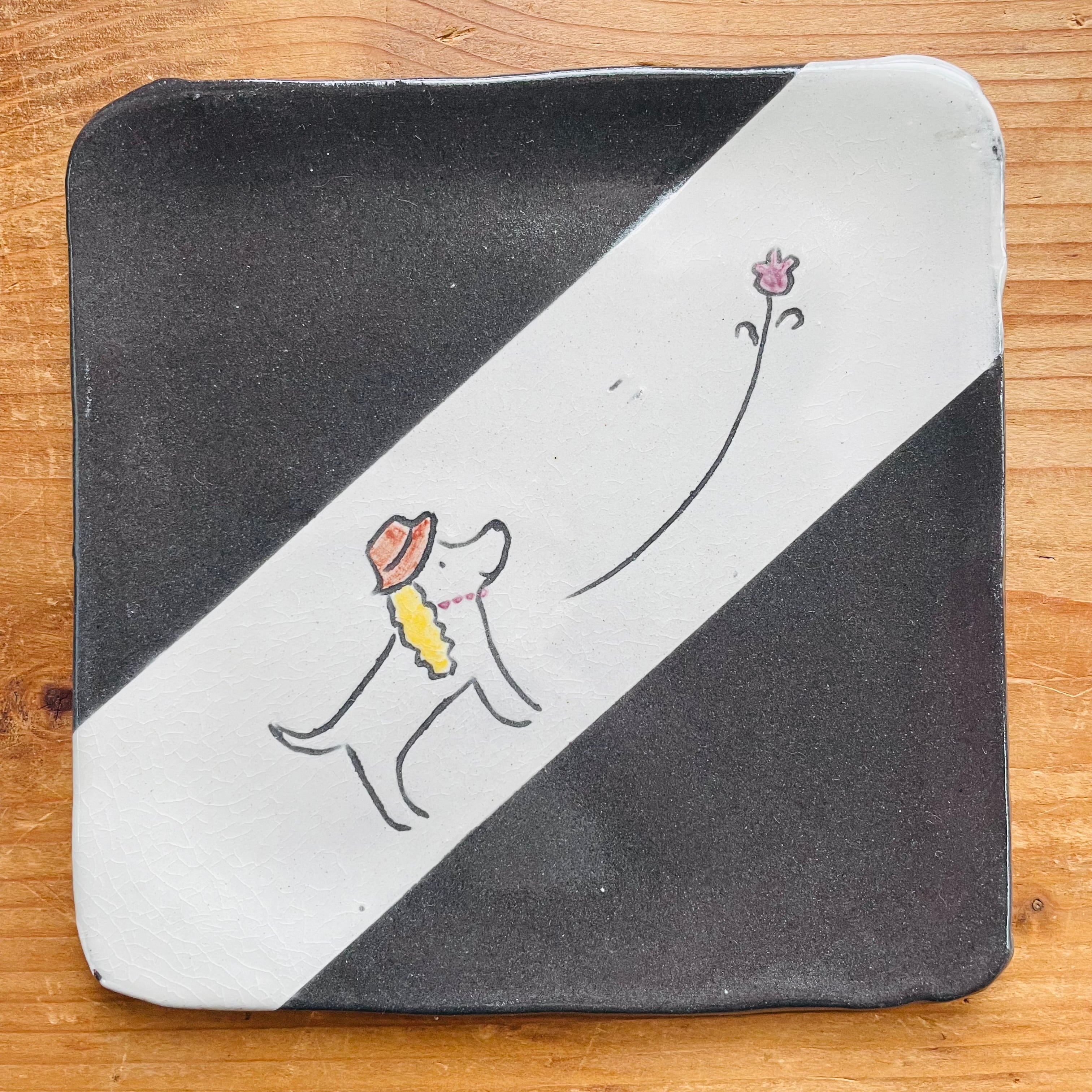 愛嬌たっぷりのワンコとバラ一輪が描かれた角プレート