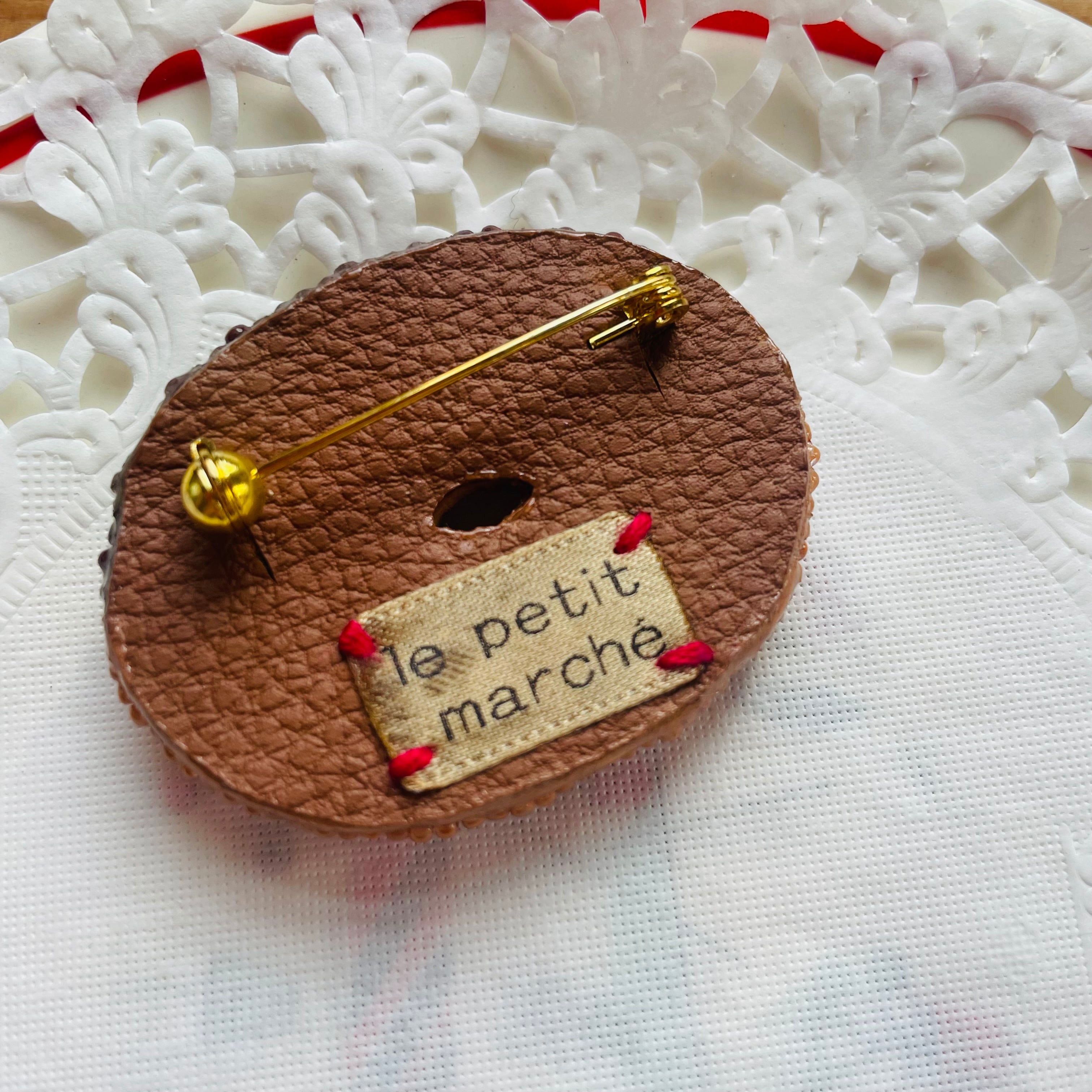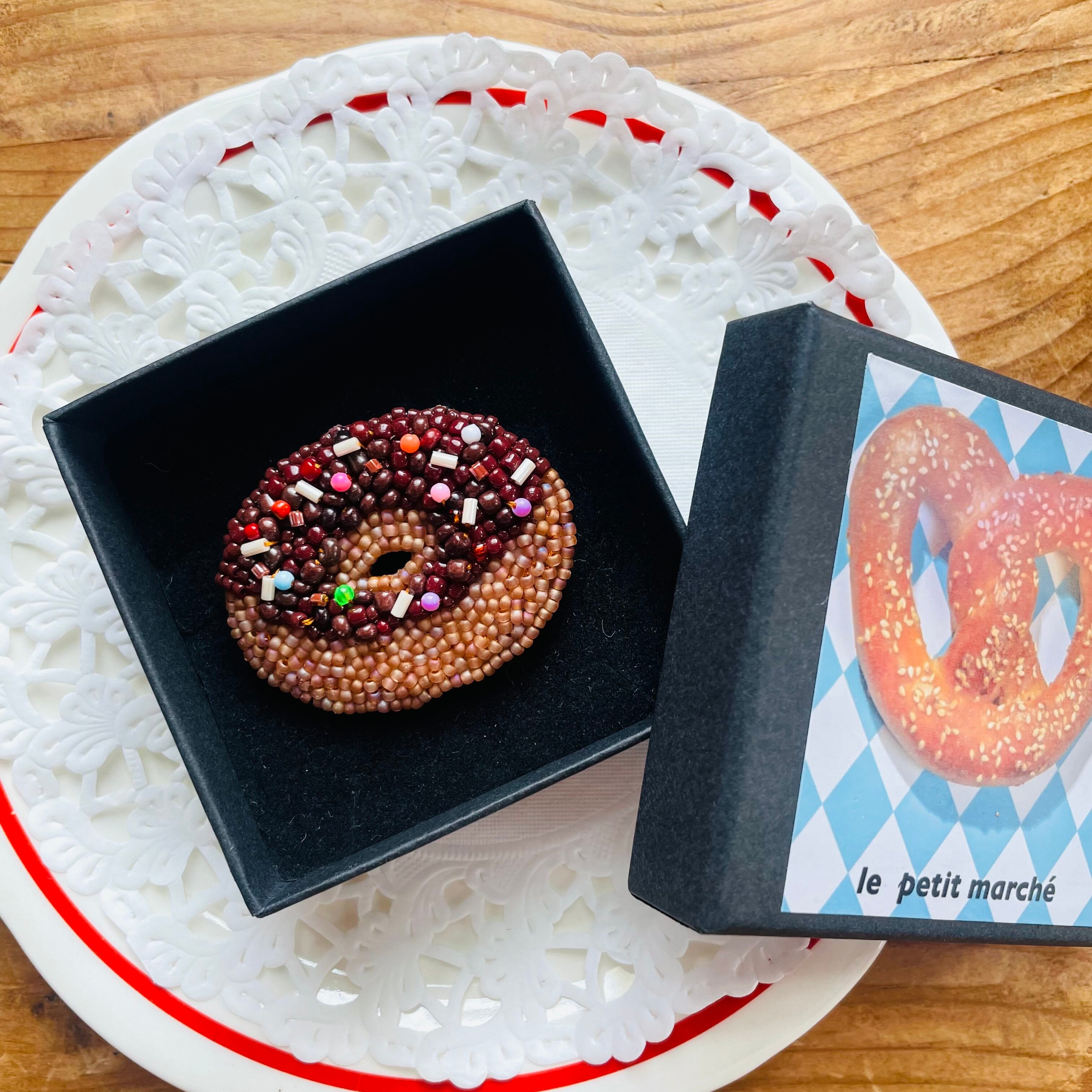 カラフルなチョコが乗ったドーナツブローチ。