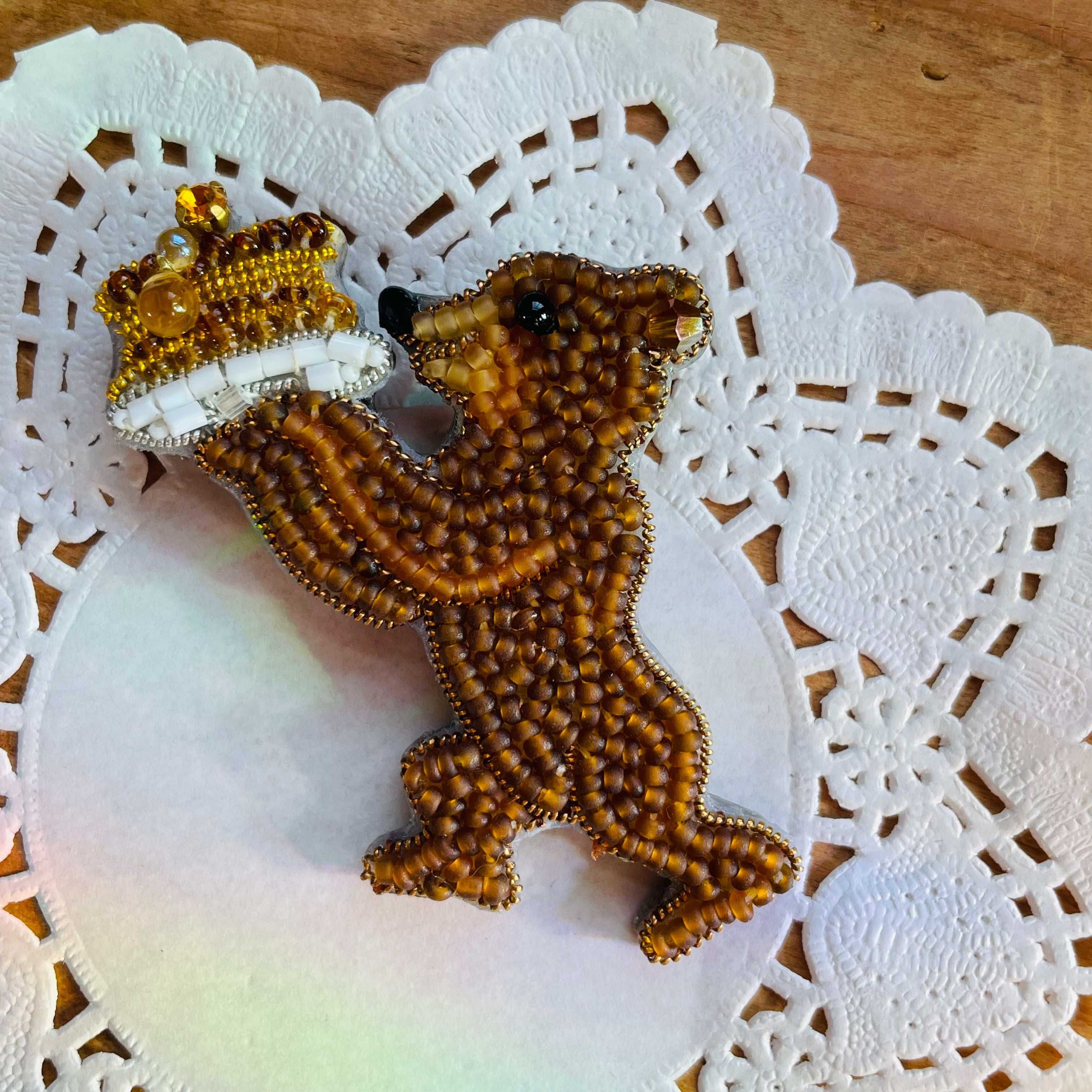 パンケーキを持った可愛らしいクマのブローチ。