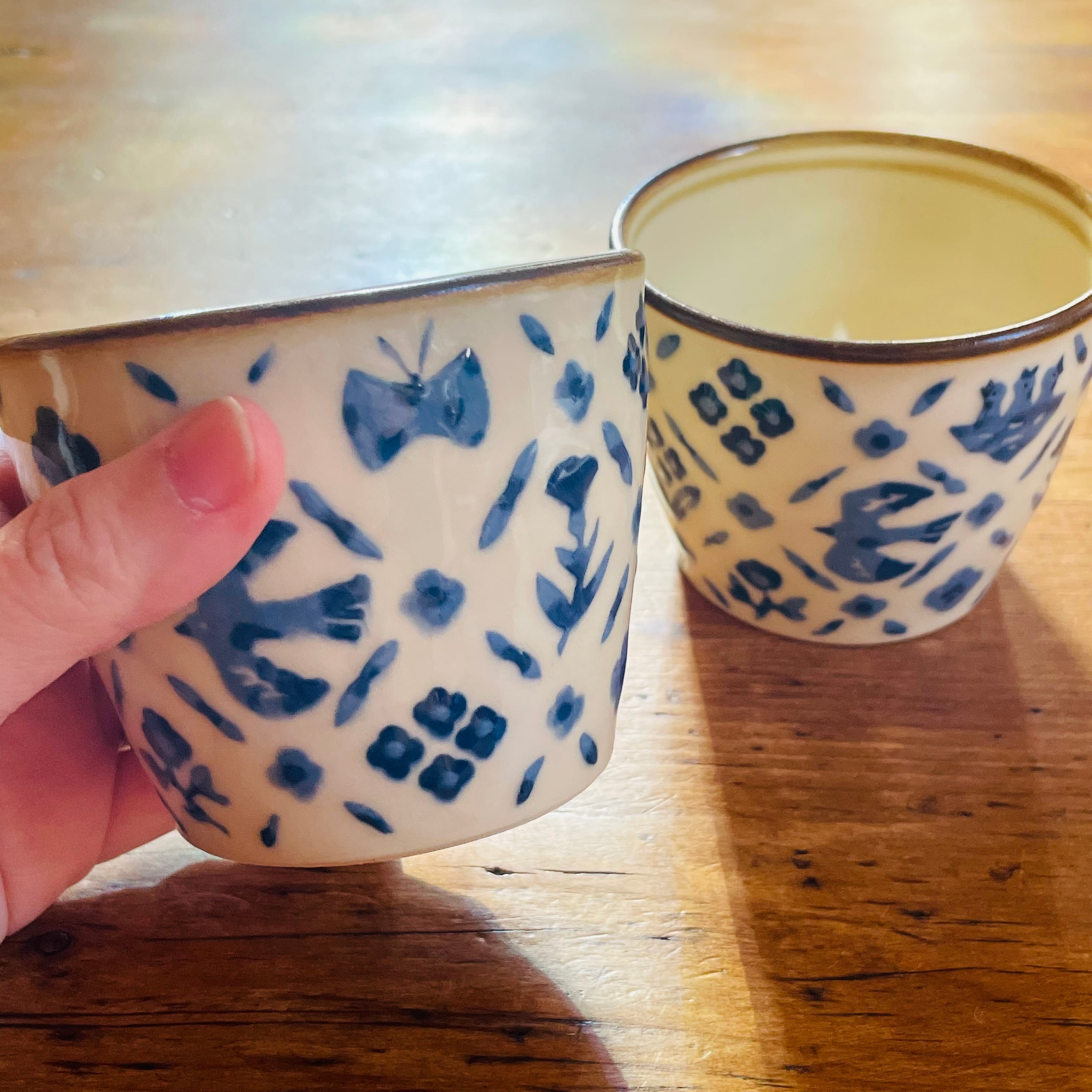 物語の挿絵のような鳥や蝶、花の模様のカップ♪