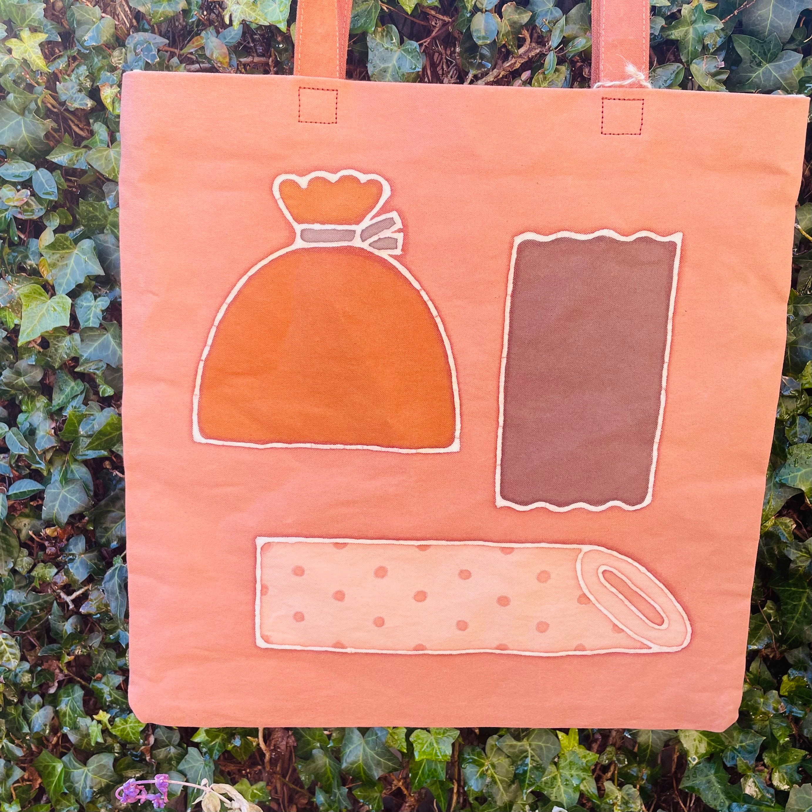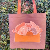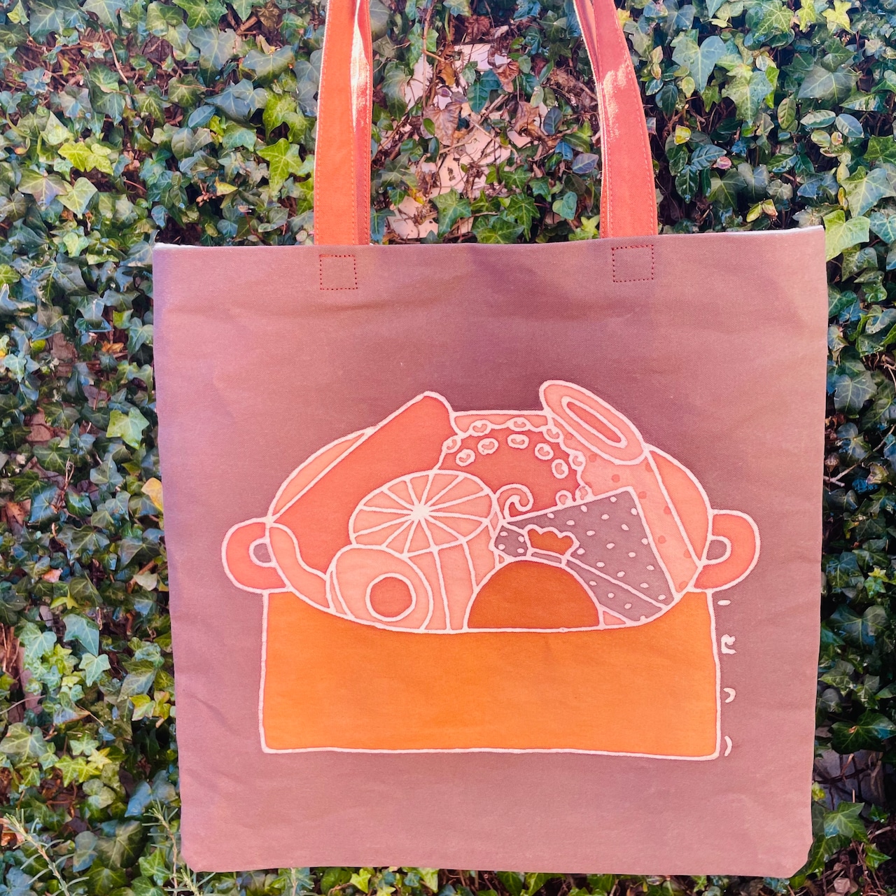 ほかほかと湯気が見えて来そうな素敵な図案に柿渋染の温かみのある色合いがたまりません。