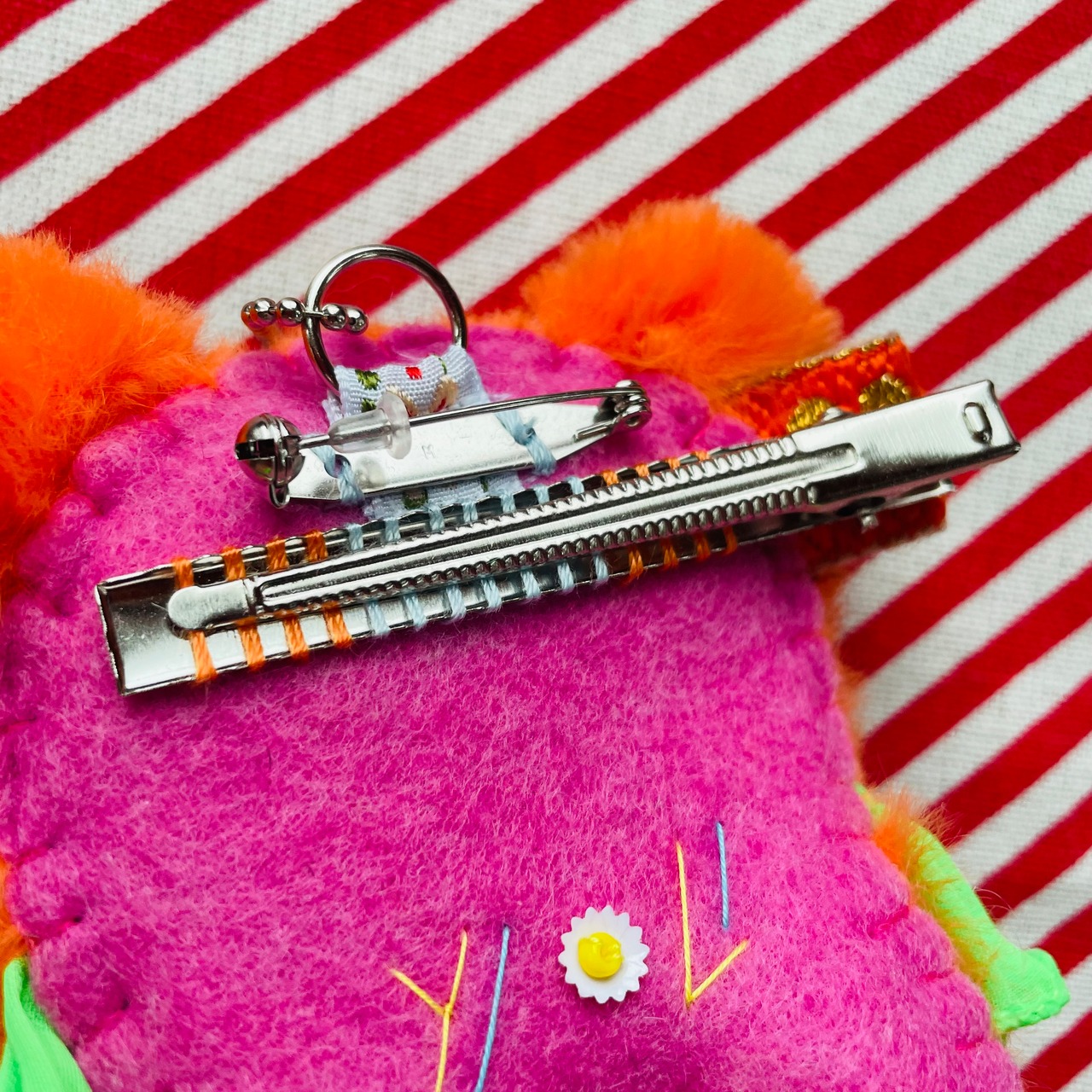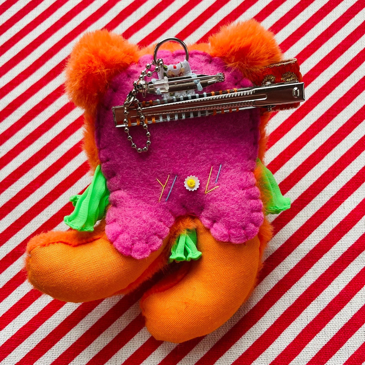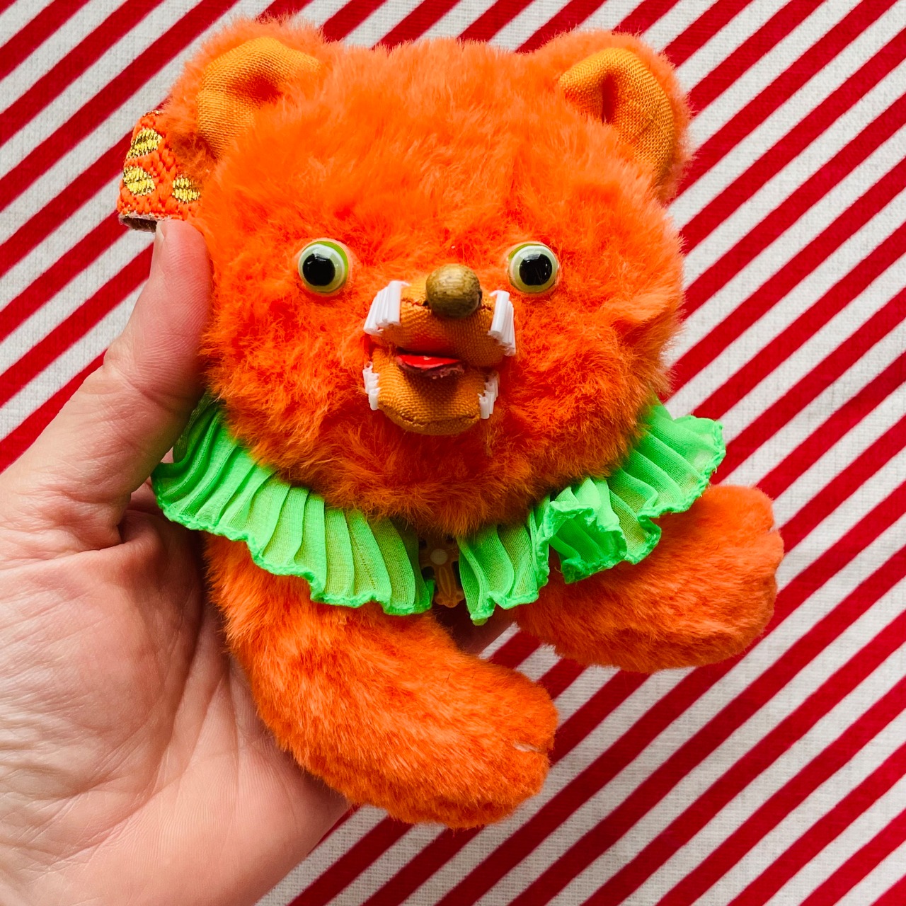 おしゃれな襟を身に着けた、ビビットオレンジカラーのくまブローチが届きました♡