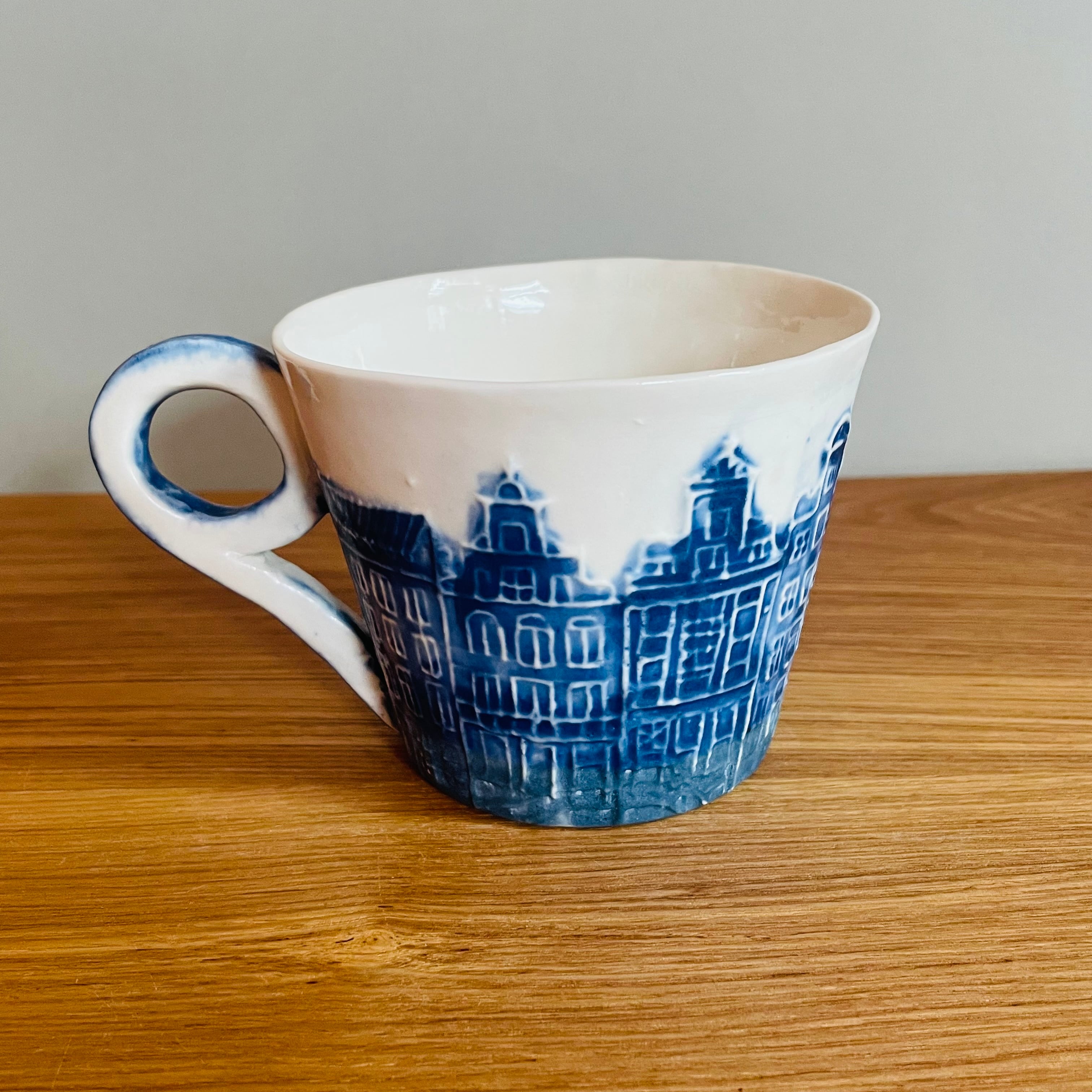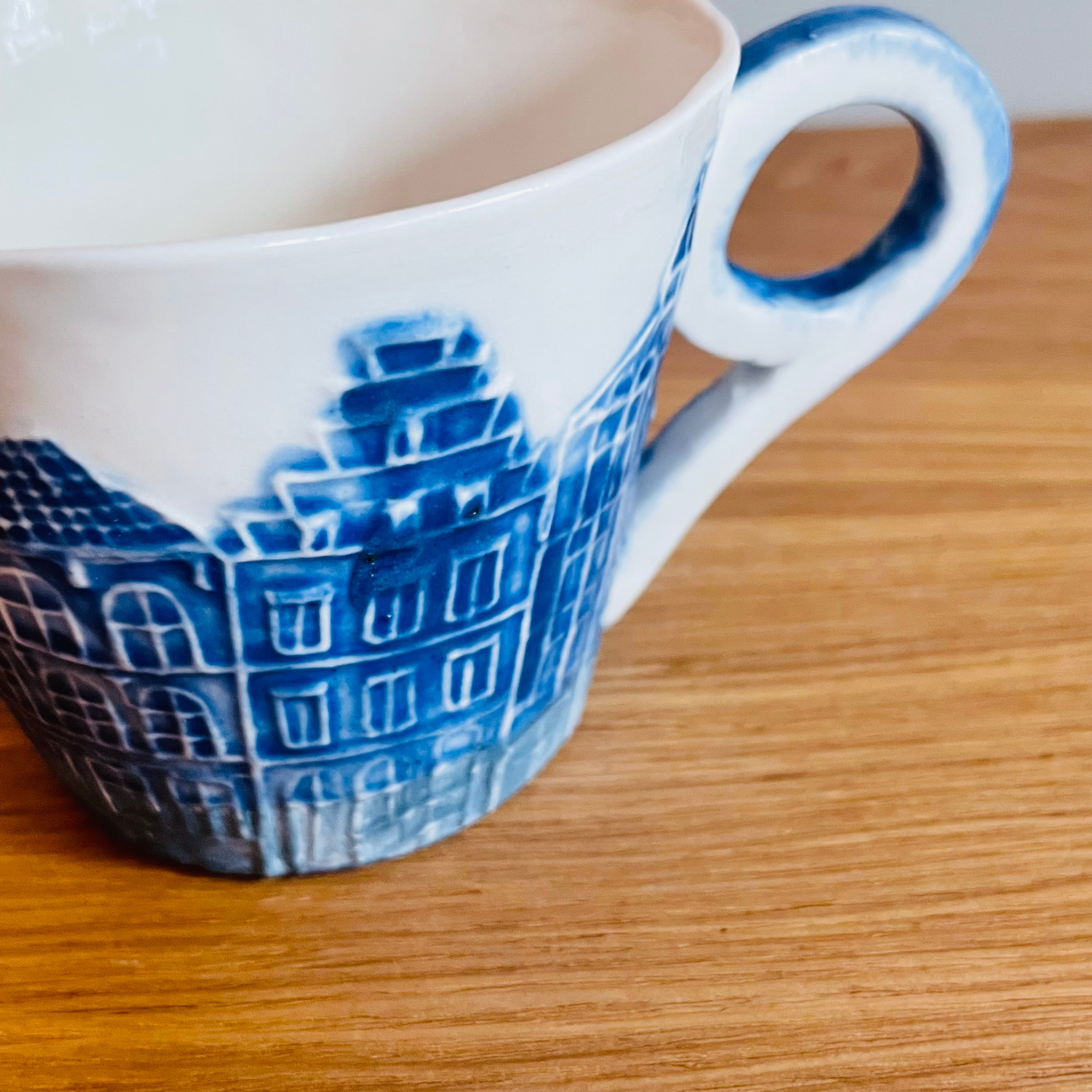 春の青空のような鮮やかなブルーで街並みが描かれたアートな作品です。