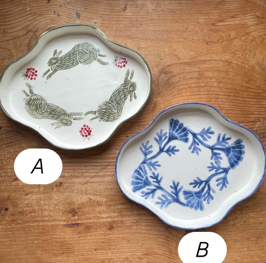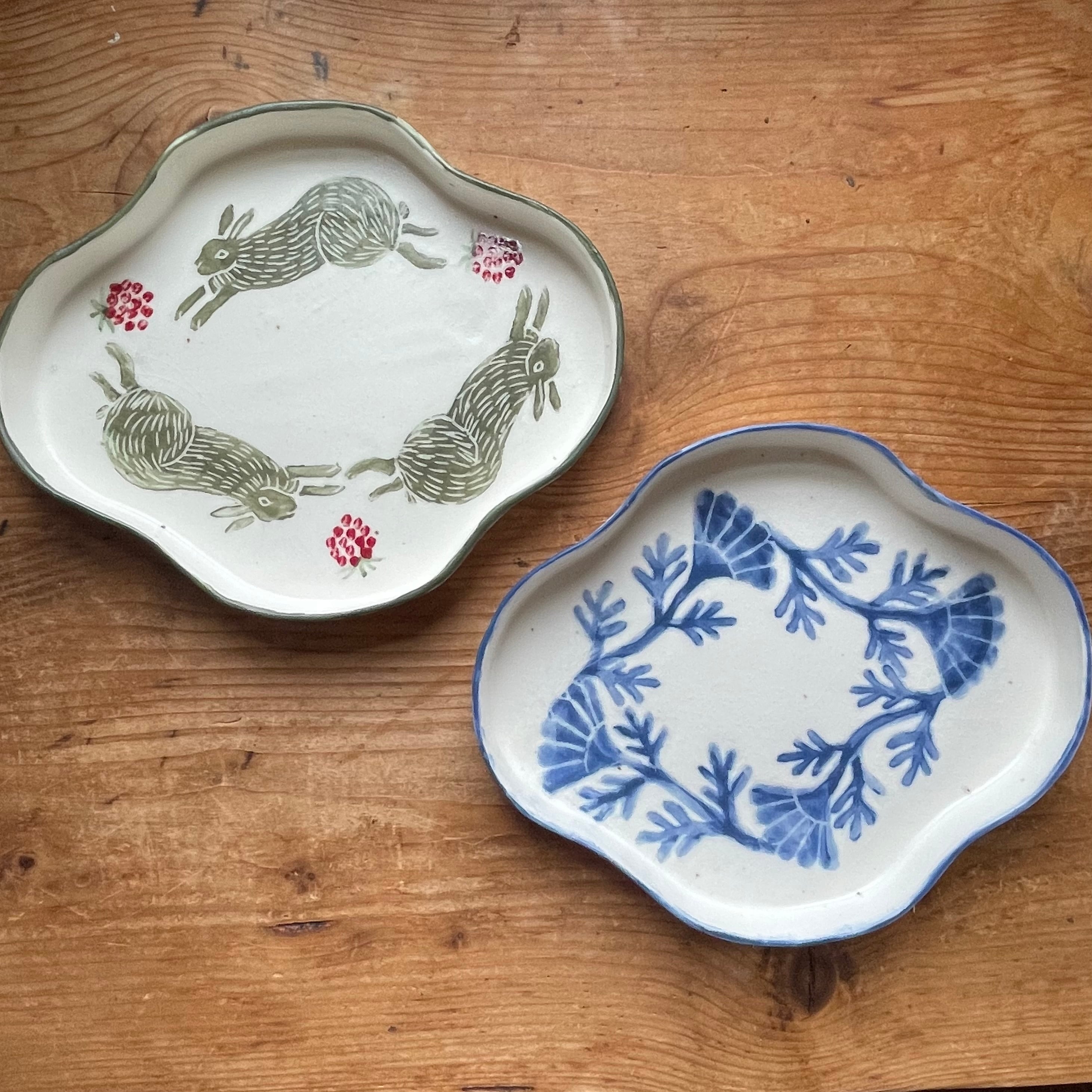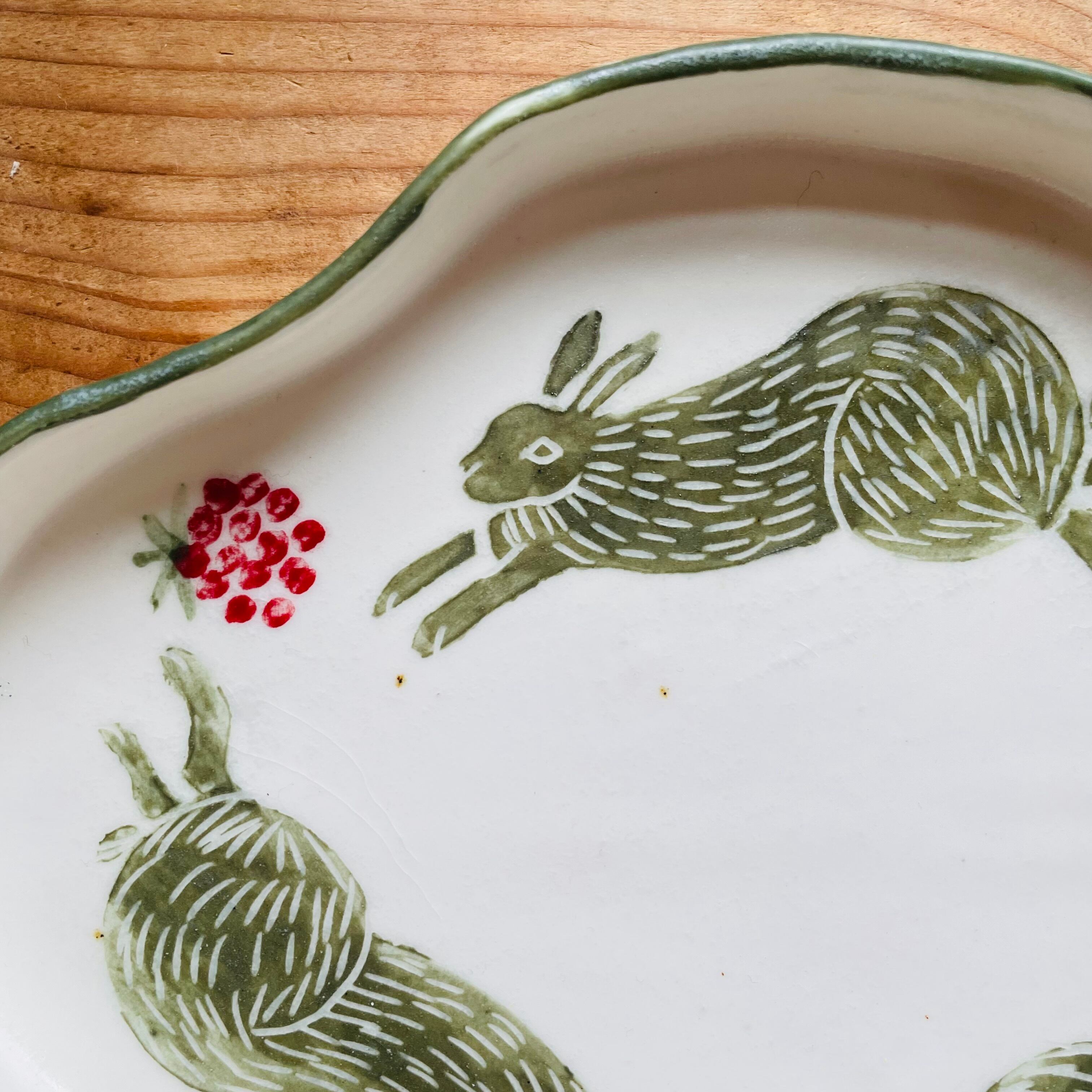 淡いグリーンのうさぎと鮮やかなブルーの花模様が描かれたうつわ