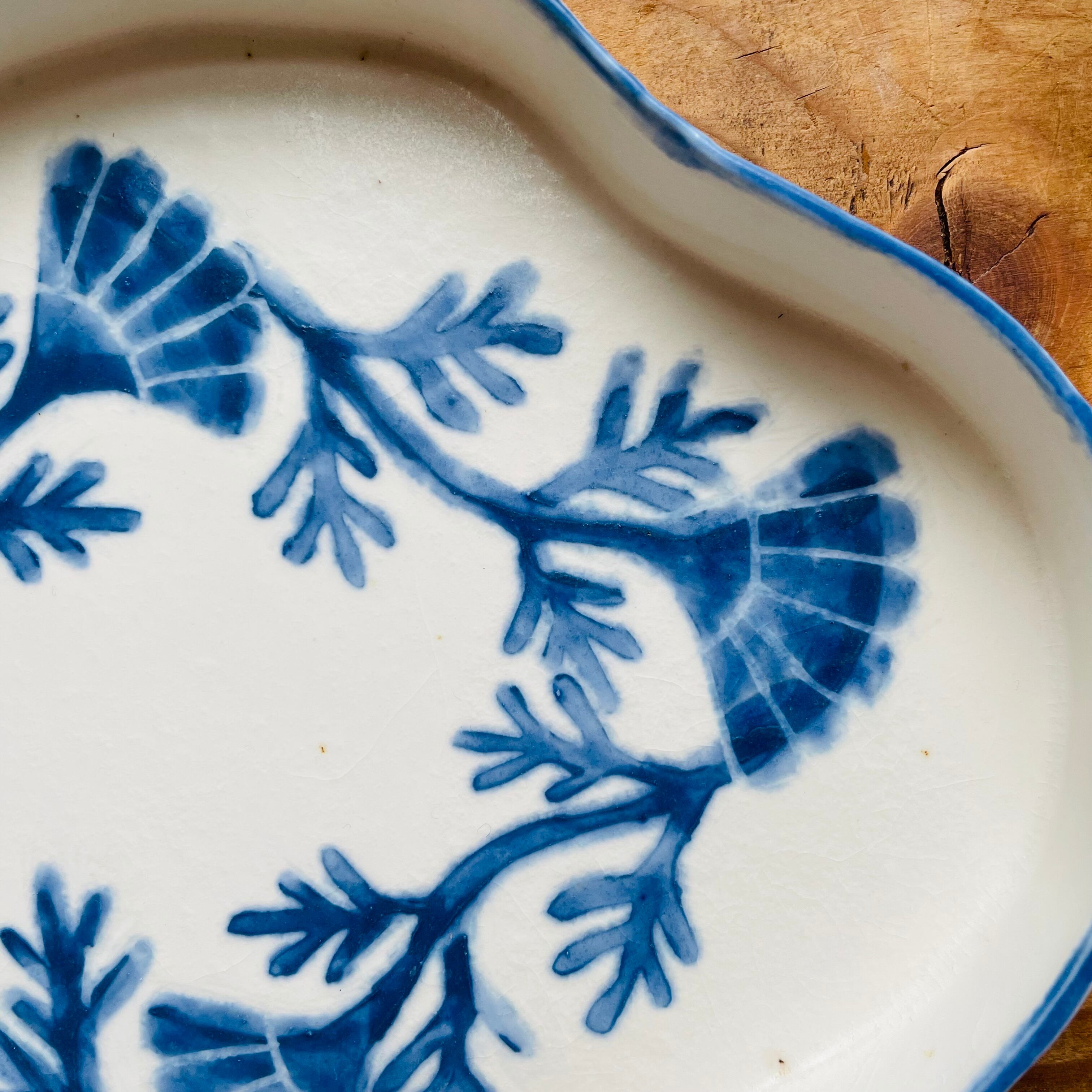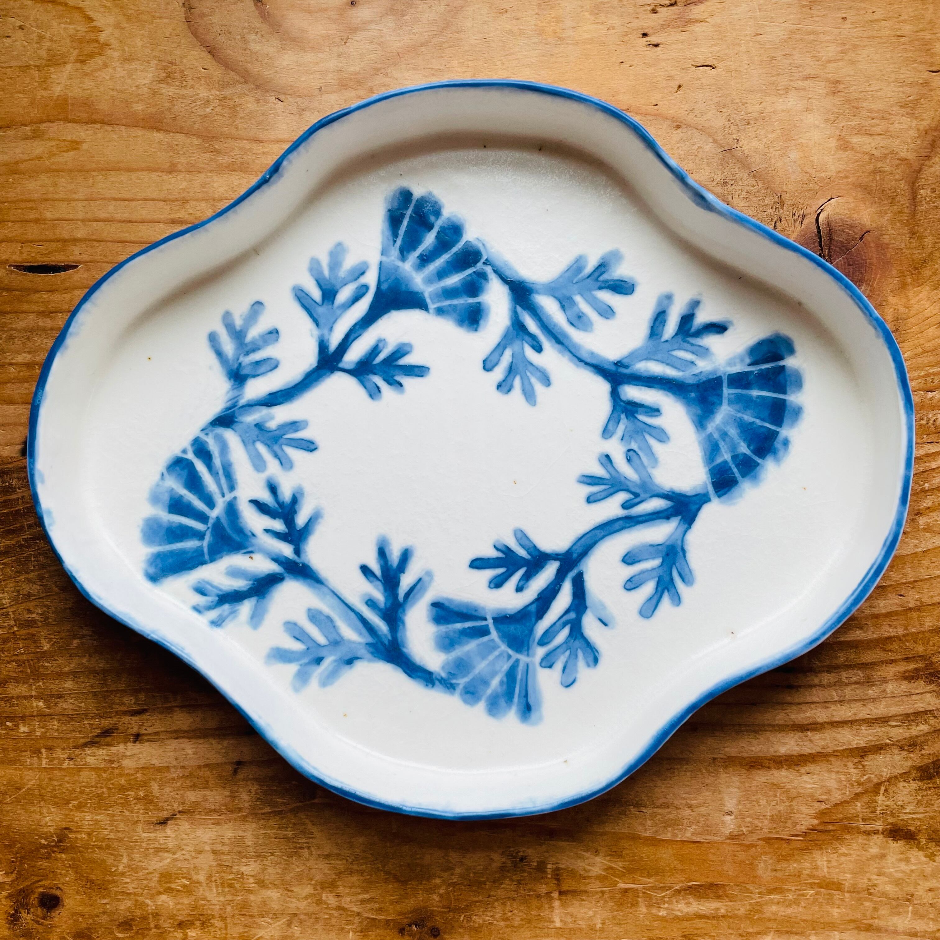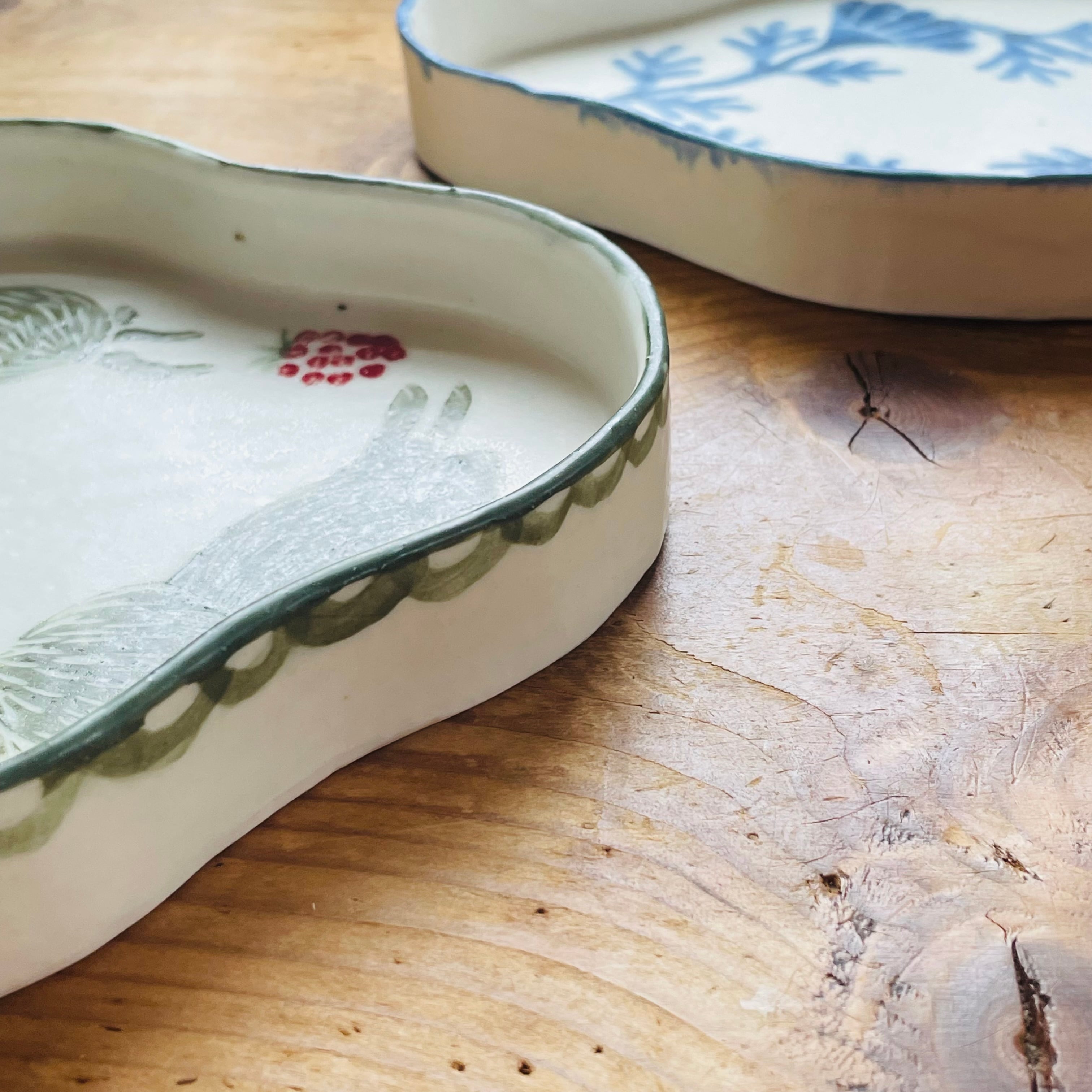 淡いグリーンのうさぎと鮮やかなブルーの花模様が描かれたうつわ