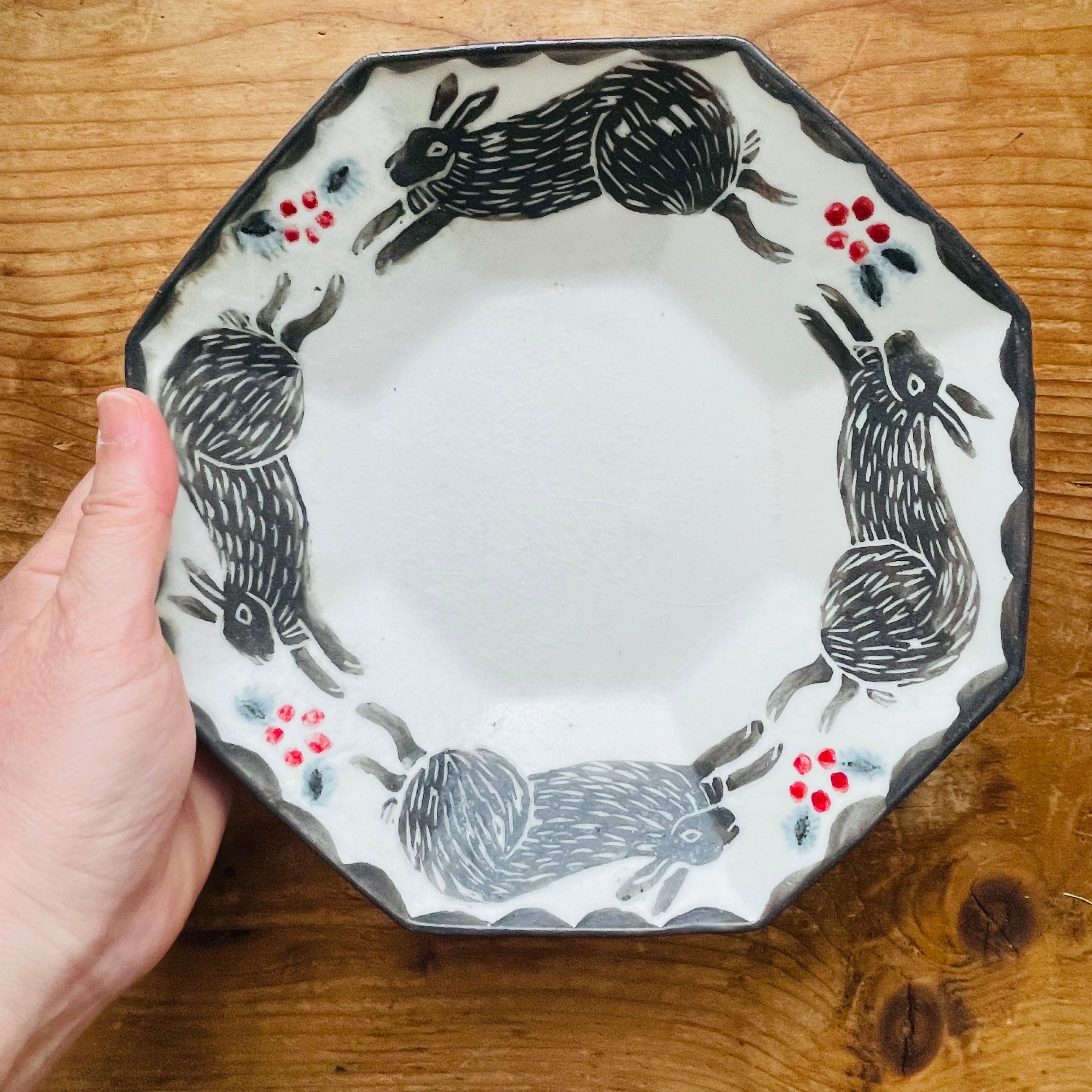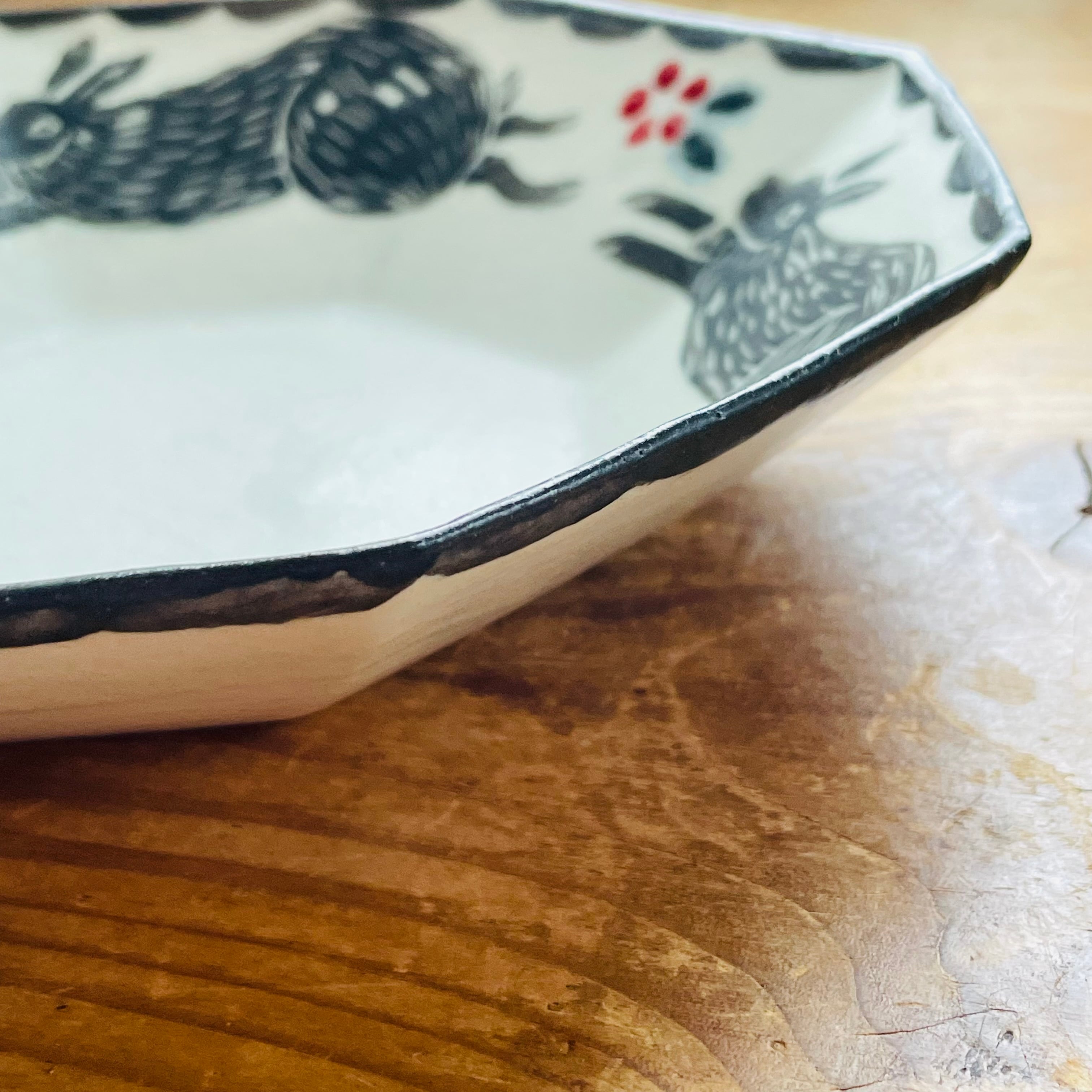 野山を跳ねまわるうさぎが描かれた八角皿