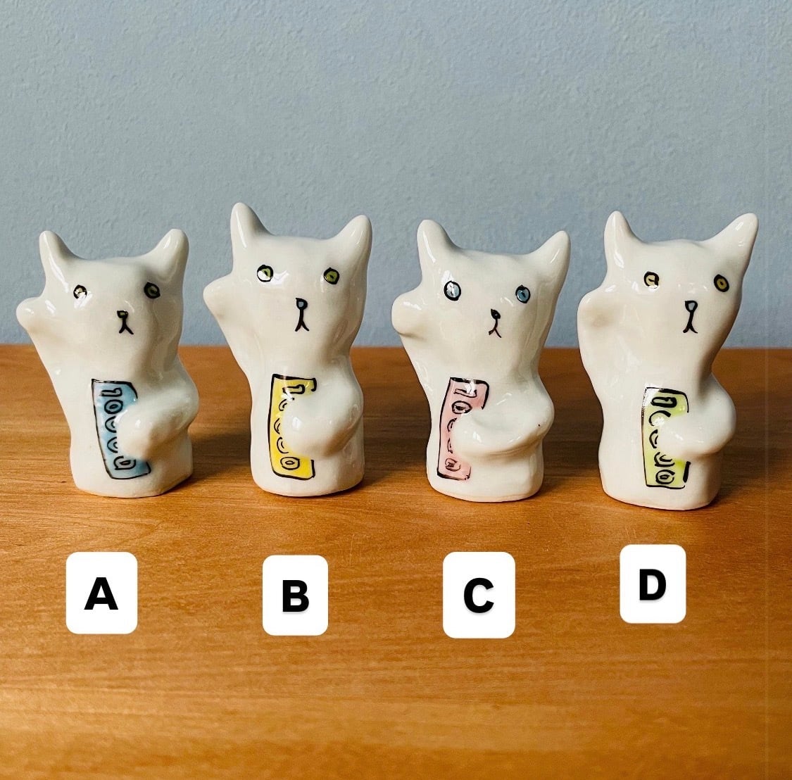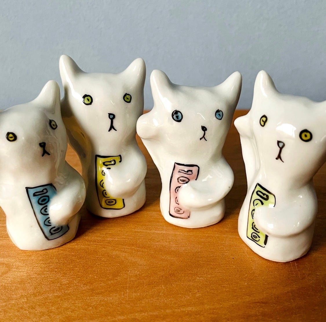 一万円札を手に抱えた小さな招き猫オブジェ