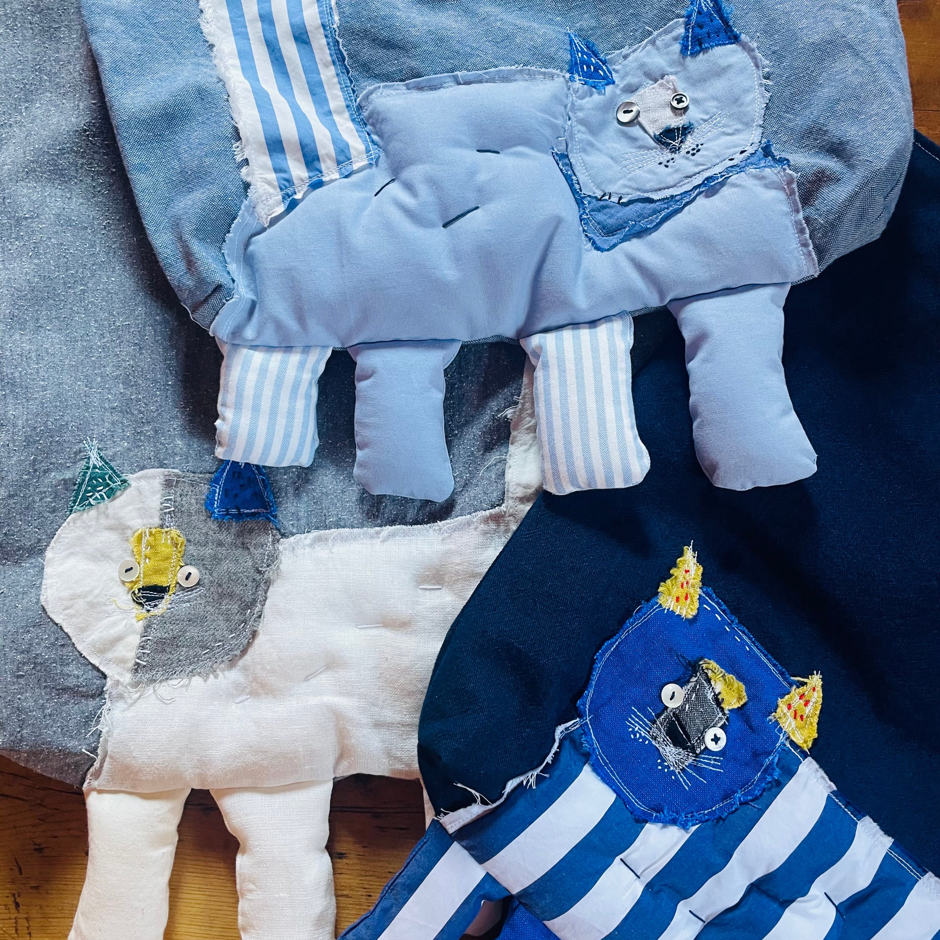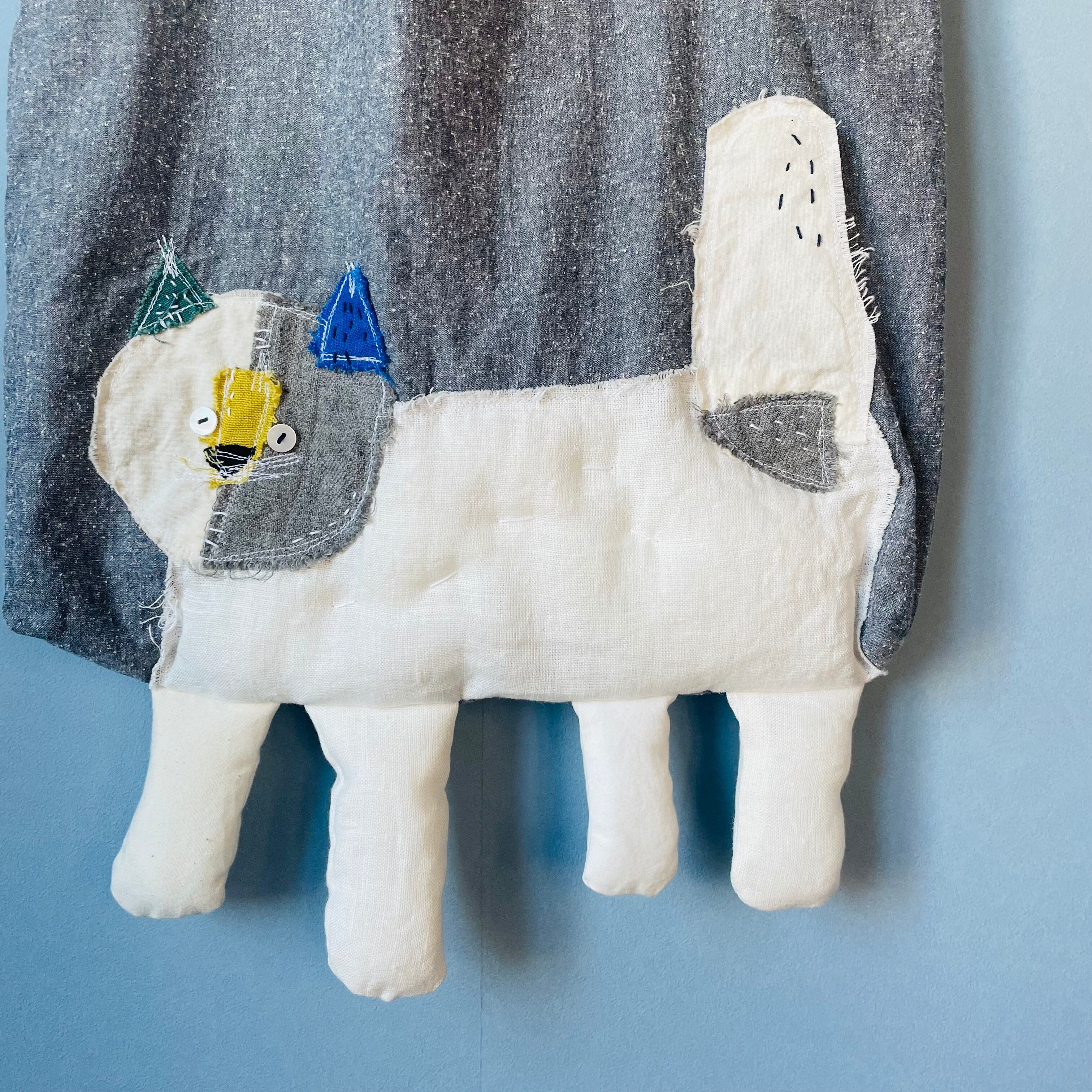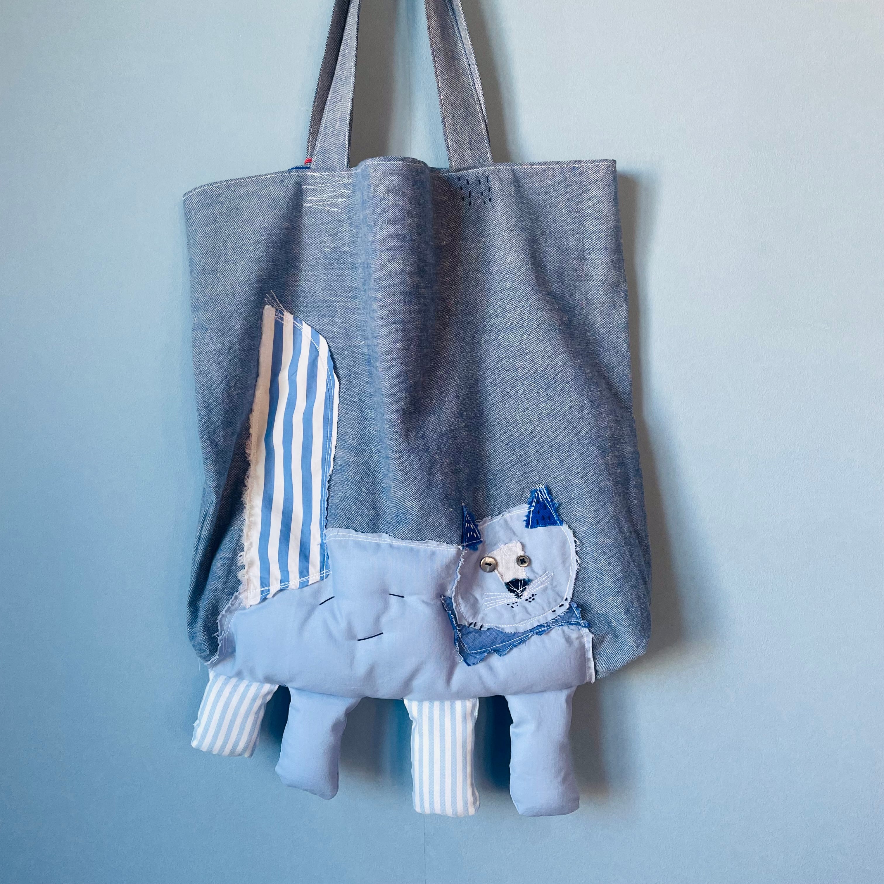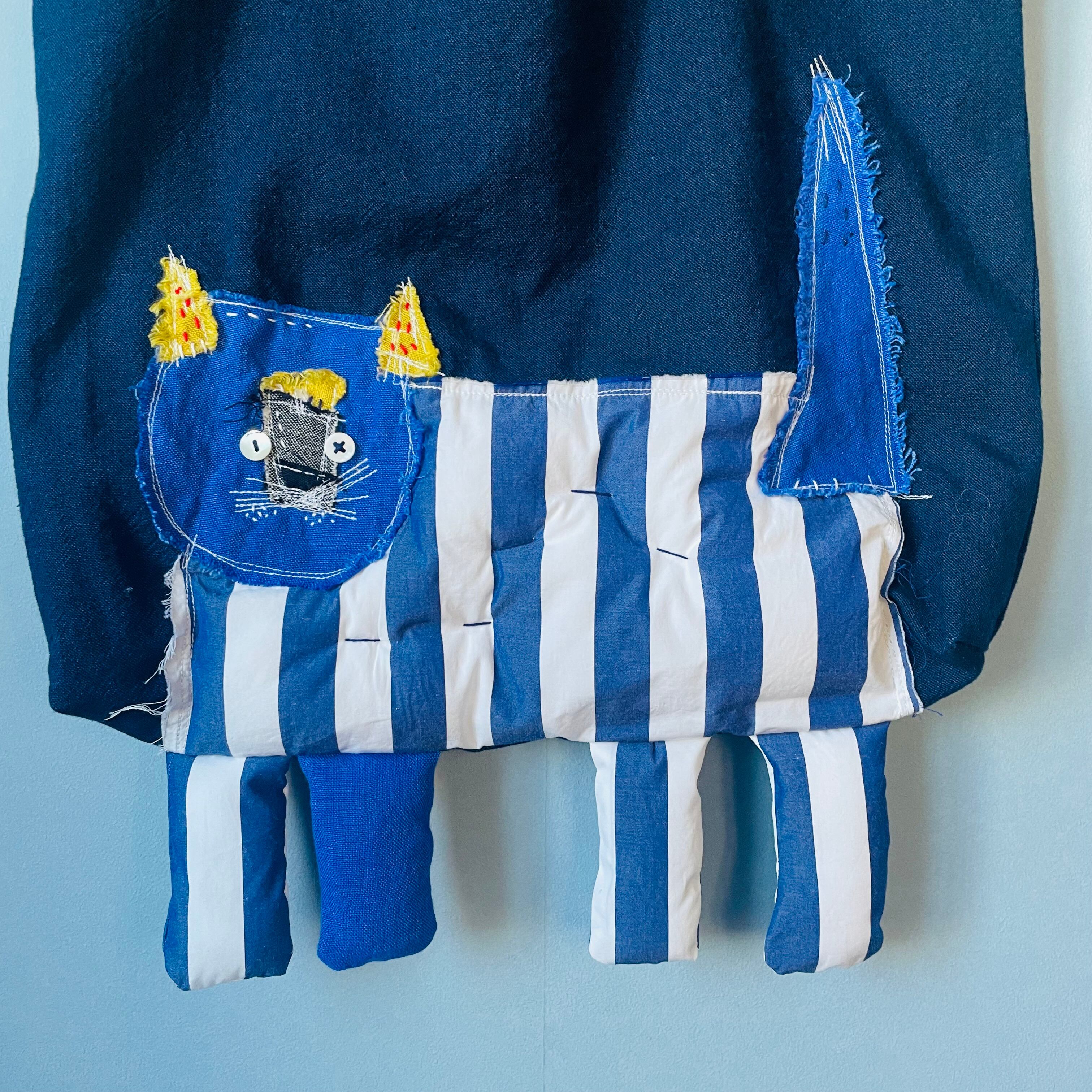 さまざまな布でコラージュされた猫と並んでお散歩しているような楽しいバック