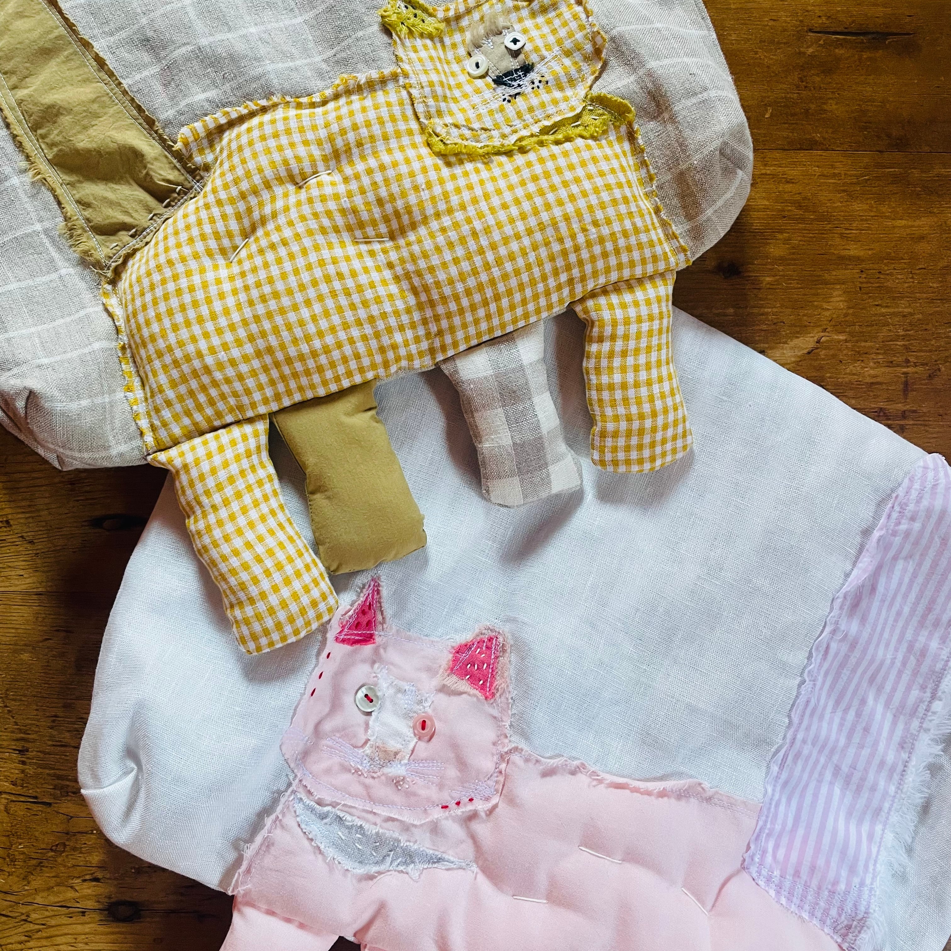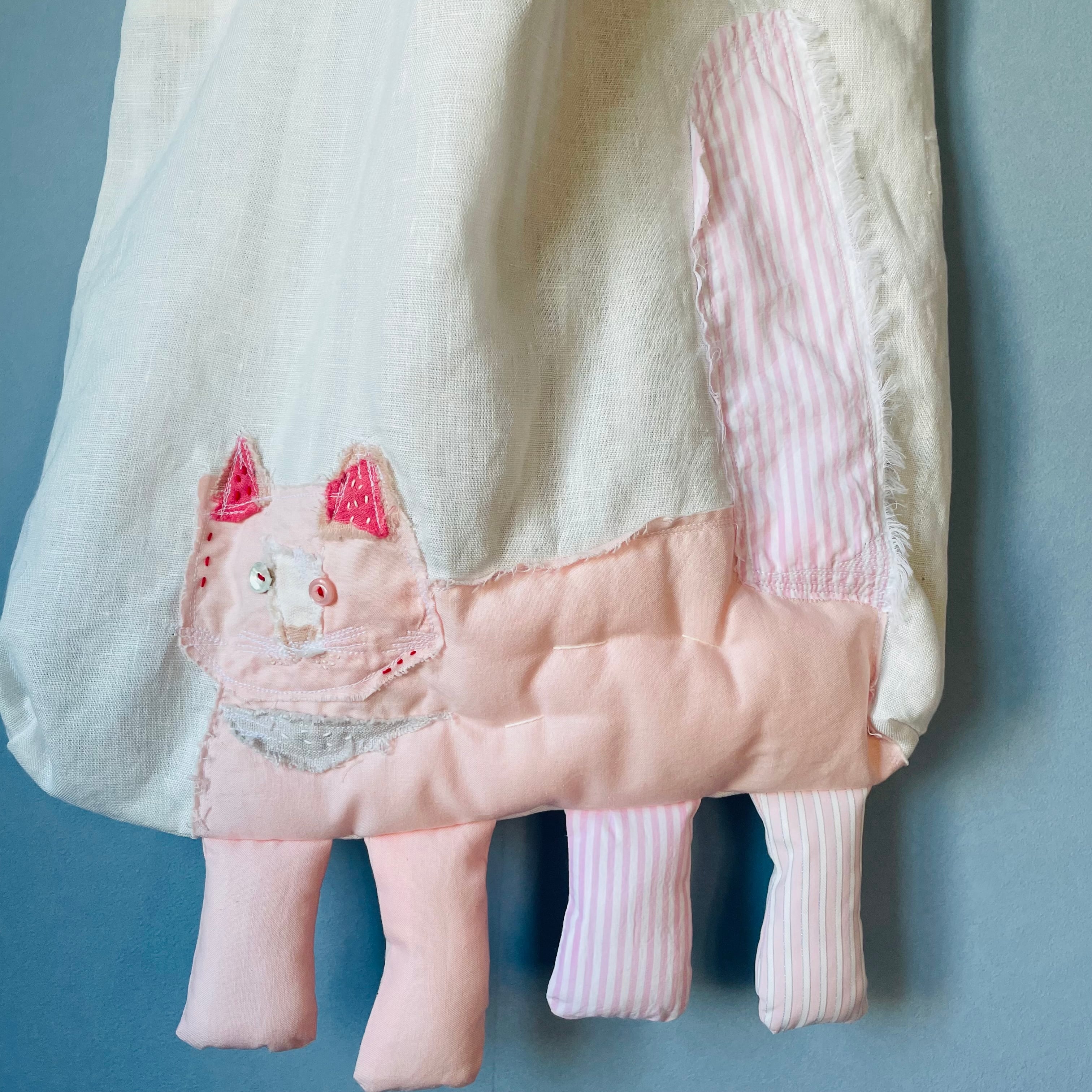 さまざまな布でコラージュされた猫と並んでお散歩しているような楽しいバック